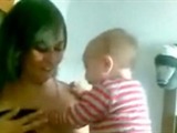 Bebé lucha por quitarle la blusa a una hermosa joven