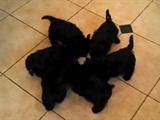6 cachorros terrier escocés, la misma raza de la película La dama y el vagabundo, se preparan para recibir un poco de leche y de un momento a otro empiezan a girar como jugando a la rueda rueda.