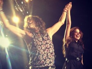 Los asistentes, y claro! con alma de rockeros, al imponente concierto de AeroSmith en la Arena Ciudad de México se llevaron la sorpresa de encontrar en el escenario a la intérprete de “Pelo suelto” y “Zapatos viejos”, Gloria Trevi. Además la cantante compartió en twitter, muy orgullosa, y con su cara más “loca”, la foto en la que se ve al líder de la banda, Steven Tyler y a ella muy emocionados.