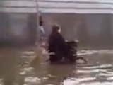 En una calle inundada podemos observar a un perrito que ayuda a empujar la silla de ruedas de su dueño