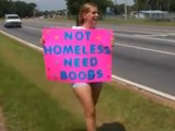 Sostiene un cartel que dice “No soy una sin techo, necesito agrandarme los senos