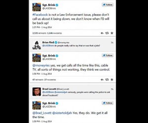 "Facebook no es un problema de la aplicación de la ley, por favor no nos llamen para decir que se cayó. No sabemos cuándo volverá a funcionar", tuiteó Brink en su cuenta. Y luego, ante la respuesta de gente sorprendida por lo que contaba, comentó que realmente había recibido esos llamados y que había compartido ese mensaje para prevenir más reclamos de este tipo.