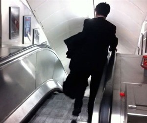 Un hombre elegante y con abrigo en mano se tambaleaba y hacia malabares para sostenerse en la escalera electrica en el metro de Londres.
