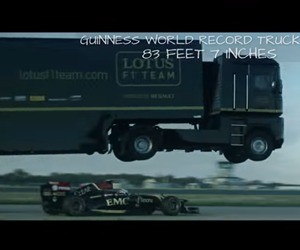 En las imágenes, usted verá una acrobacia donde este gran camión, ayudado por una rampa, salta y de inmediato un carro de fórmula uno pasa debajo de él. Por supuesto, todo pasa a máxima velocidad rompiendo el récord mundial al salto en camión más largo (25.4 metros).