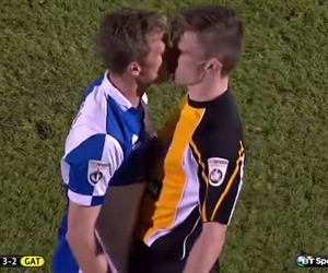Lee Mansell, mediocampista del Bristol Rovers, fue quien recibió la tarjeta amarilla por darle dos besos en la boca a J.J. O’Donell del Gateshead, quien quedó paralizado con la situación.