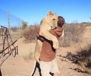 Los dos evidencian una calida y efusiva demostración de amor. Tanto que la feroz leona parece ser un inofensivo gatito.