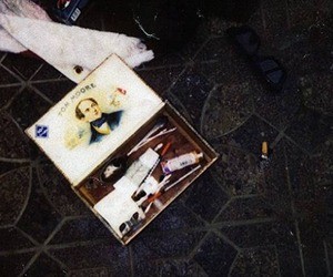 Una de las dos imágenes publicadas mostró una pequeña caja de cigarrillos que contenía una cuchara, agujas y una tirada en el suelo junto a una colilla de cigarrillo y un par de gafas de sol oscuras.