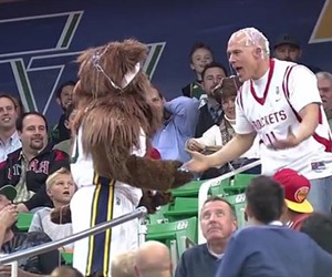 Muchos borrachos actúan furiosos y más cuando le botan la cerveza este es el caso de un aficionado del básquet, que casi se va a los puños con la mascota del otro equipo: