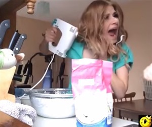La joven y su ayudante se encontraban bromeando mientras realizaban todas las tareas culinarias. Por supuesto, por momentos, ella también se acerca a la cámara para asegurarse de estar en el ángulo más propicio; pero, en uno de estos intentos, el cabello de la chica se atasca en uno de los mezcladores y se enreda.