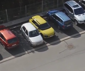 El incidente ocurrió en Praga, República Checa, donde una mujer rubia llegó en su auto y vio que había un lugar entre un auto amarillo y uno rojo.