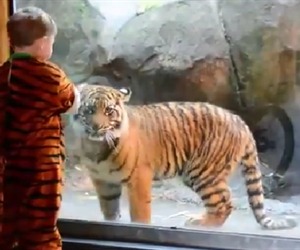Pequeño rockerito se disfraza de tigre y juega con felino (video)
