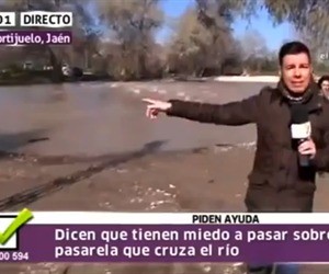 Un periodista español estaba dando un reporte en directo sobre la crecida de un río en la aldea de El Cortijuelo cuando repentinamente terminó en el agua