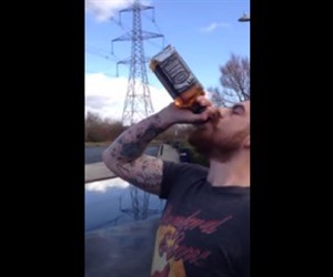 Como si fuera agua el hombre con un estilo muy parecido a un integrante de una banda de rock, inicia destapando la botella de Jack Daniels que se encuentra sellada; sin dejar a un lado su cigarrillo, empieza el reto y en un abrir y cerrar de ojos desaparece todo el whisky de la botella.
