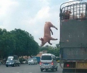 Al parecer todo ocurrió en la provincia sureña de Guangxi, en China donde, según testigos, el puerquito se subió al lomo de uno de sus compañeros, trepó las reja del camión de carga y finalmente se lanzó a la calle, escapándose de la muerte en el matadero.