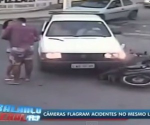 En Brasil, un conductor de un carro miró a un solo lado de la calle antes de cruzar y se llevó por delante a una pareja que iba en una moto.