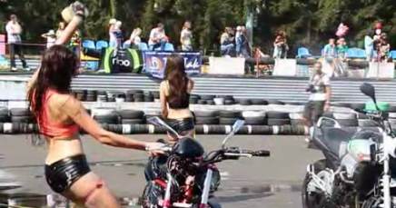 He aquí el cliché de lo sexy: una chica con poca ropa, una moto y movimientos muy sexys.