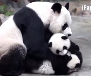 Por eso le presentamos este video que muestra a una mamá oso panda jugando con sus dos pequeñitos.