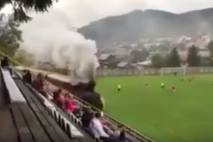 Esto es lo que sucede en Cierny Balog, un pueblo de Eslovaquia, en la que un tren divide la cancha de la tribuna.