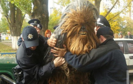 Hace unas horas, durante el día de las elecciones locales en Ucrania, un hombre disfrazado de Chewbacca fue arrestado por hacer campaña por el partido de Darth Vader.