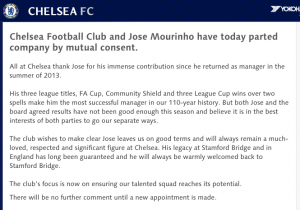 El Chelsea hizo público un comunicado donde agradeció el trabajo del entrenador portugués, señaló que el acuerdo fue mutuo y calificó a Mou como el entrenador más exitoso en los 110 años de la historia que tiene el club: