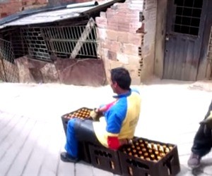 Este hombre que se encarga de recoger las botellas de cerveza, de lugares donde usted y sus amigos se la pasan, usa las canastas como medio de transporte.
