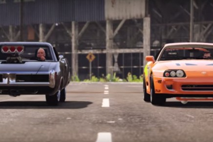 La escena muestra versiones virtuales de Vin Diesel y Paul Walker compitiendo con sus vehículos sobre la pista. La recreación incluye uno de los momentos más destacados, la escena del tren.