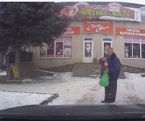 Un hombre sale de un supermercado con una gaseosa, después se detienen un momento para tomar un poco. Abre la botella, toma un sorbo y de un momento a otro, todo colapsa.