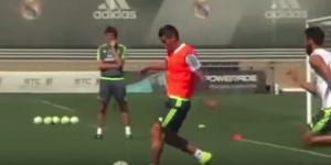 El colombiano dejó esta imagen durante el entrenamiento del Real Madrid: robó balón, empezó carrera y definió como los grandes… ¡de vaselina!