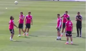 En la sesión de calentamiento de uno de los entrenamientos del Real Madrid, los dos suramericanos se tiran lujitos con el balón y el portugués apenas los observa. Ojo a este Ronaldo rechazadito.