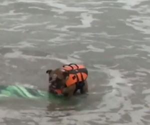 Para este nuevo video, su dueño, Iván Juscamaita, lo entrena para que pueda surfear un par de olas.