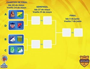 El ganador entre Huila y Tolima enfrentará al que gane entre Junior y Medellín. Mientras que la otra semifinal será entre los ganadores de Millonarios-Envigado y Nacional-Cali. Las semifinales se jugarán el 27 y el 31 de mayo; la final el 3 y 7 de junio.