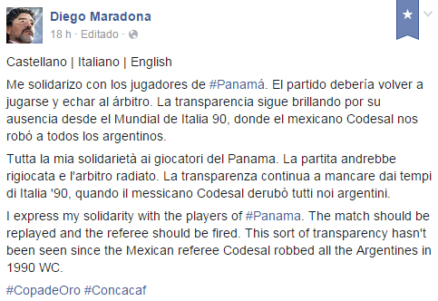 El ex jugador y entrenador de Argentina publicó en sus redes sociales un mensaje apoyando a la selección de Panamá, que fue eliminada de la Copa de Oro por culpa de un polémico arbitraje.