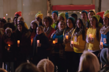 En el comercial, se ve a los empleados salir de su tienda en New York para reunirse junto a un pequeño coro de niños en las puertas de la tienda de Apple. Una vez instalados comienzan a cantar “Let There be Peace on Earth”.