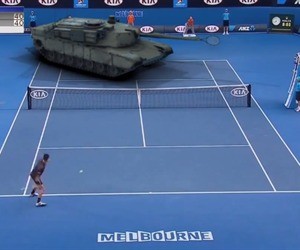 Este usuario de YouTube, puso al tenista Novak Djokovic a jugar contra un tanque M1 Abrams con un saque fenomenal.