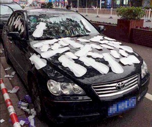 Así, Tan se desquitó de su novio pegando en su carro un montón de toallas femeninas.