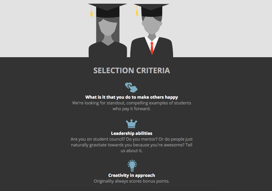 De hecho, los candidatos interesados deben escribir un ensayo que incluya entre 1000-1500, el cual debe responder a la pregunta: “¿Cómo usted se esfuerza para hacer felices a los demás?“.