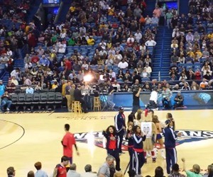Las compañeras animadoras y la mascota de los Pelicans fueron a ayudar a la chica mientras la seguridad sacaba a un Ferrell ‘ebrio’ de la arena: