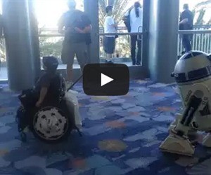 Como usted podrá ver en el siguiente video, R2-D2 estaba dando un recorrido por los pasillos cuando se topó con un niño en silla de ruedas, con el cual empezó a interactuar para sacarle unas cuantas sonrisas.