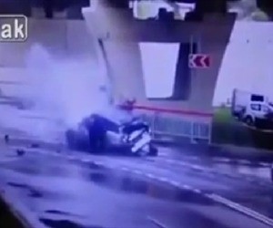 En Sochi, Rusia un auto perdió el control cuando andaba a alta velocidad. Salió volando desde una autopista y cayó con el auto destruido, sin embargo, la sorpresa que se llevó el transeúnte que lo fue a socorrer fue grande cuando el piloto salió del vehículo caminando como si nada.