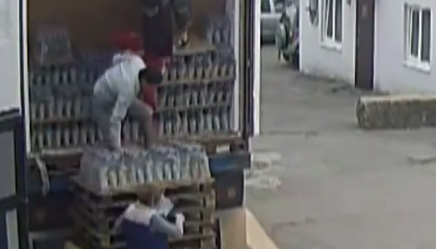 Una cámara logró grabar el momento en el que unos rusos accidentalmente destruyen cuarenta cajas con botellas de vodka.