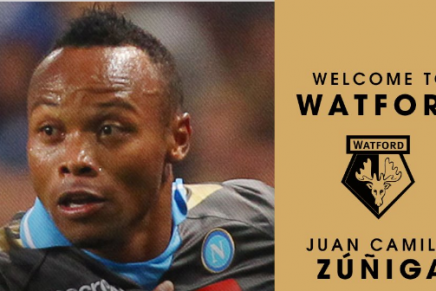 “Watfod FC se complace en confirmar que se ha logrado un movimiento de traspaso con Juan Camilo Zúñiga, un préstamo durante toda la temporada. El experimentado internacional de Colombia ha firmado un acuerdo de préstamo desde el equipo italiano, Napoli. Watford mantiene la opción de una compra”, fue el comunicado que publicó el Watford, nuevo equipo de Zúñiga, y sigue: “Después de una impresionante primera temporada en Italia con Siena, Zúñiga firmó con Napoli por 8,5 millones de € en 2009 y disputó 163 juegos por la Serie A, incluyendo un período de cuatro años bajo la dirección del actual técnico del Watford, Walter Mazzarri”