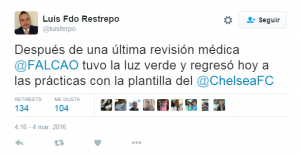 Hoy hay una buena noticia gira en torno a un futbolista que desde hace tiempo viene salado: ¡así es!, nuestro tigre Falcao. Hoy los médicos del equipo de Londres dieron el alta médica para que el delantero regresara a los entrenamientos, después de una extraña lesión, de la que poco se habló, que lo agobiaba desde octubre del año 2015.