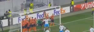 El Portero del del Shakhtar ordenó a todo el equipo pararse formando la barrera casi en la línea de gol. Mejor dicho! Solo le faltó el técnico!! ¿Será que le funcionó?.