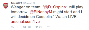 Frente al Burnley, por la FA Cup, el portero colombiano será el arquero titular de su equipo, así lo confirmo, sin rodeos, Wenger en la última conferencia de prensa antes del partido: “David Ospina jugará mañana”. La titularidad del arquero también fue confirmada por la cuenta deTwitter oficial del club. ¡Que buena noticia!