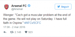Wenger en su última conferencia de prensa expresó la gran confianza que le tiene al buen portero colombiano: “Puedo confirmar que Cech no jugará el sábado y no tengo ningún problema en confiar plenamente en Ospina”.