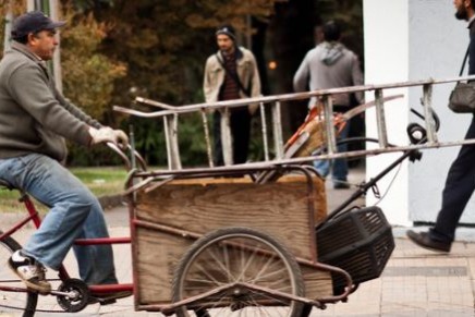 Un hombre iba en un triciclo, moviendo cientos de cajas por las calles de Shangai en China.
