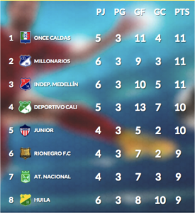 Hasta el momento se han marcado 15 goles; el único juego que no tuvo anotaciones fue el encuentro disputado entre Patriotas contra la Equidad. Mañana se termina de completar la fecha con los partidos: Pasto contra Envigado y Alianza Petrolera ante Junior; los tiburones de obtener el triunfo se convertirán en el nuevo líder del torneo.