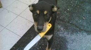 Lo que parecía un inocente perrito no resultó serlo al perseguir a su dueño con afilado cuchillo en su hocico. Su dueño le dice en reptidas ocaciones“Charlie, dale a papi el cuchillo”.