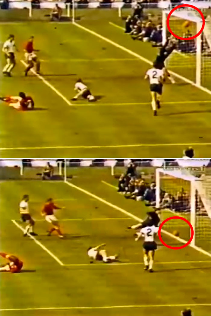 La final del mundial de Inglaterra de 1966 fue entre Inglaterra y Alemania. Al último minuto, el inglés Geoff Hurst hizo un remate que golpeó en el travesaño del arco y rebotó en el piso. El arbitro le dio la victoria a Inglaterra, pero años después se analizó de que no había sido gol.