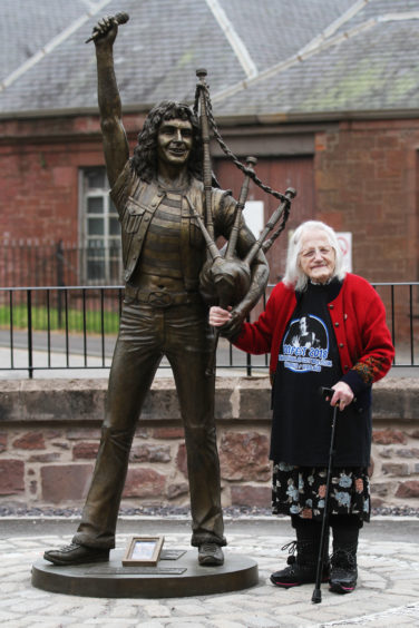 Eliza Williamson, es una abuela de 100 años, que celebró su más reciente cumpleaños junto a la estatua que hay de Bon Scott, el segundo vocalista de la banda australiana de hard rock AC/DC, en Escocia.